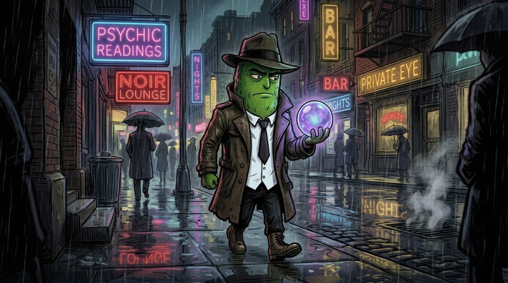 Animated pickle. Trench coat. Hat. Psychic detective — like Dick Tracy, but weirder.