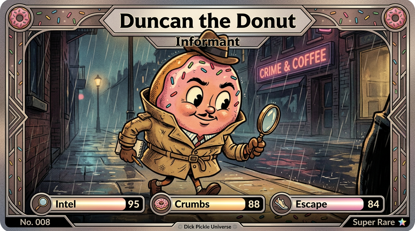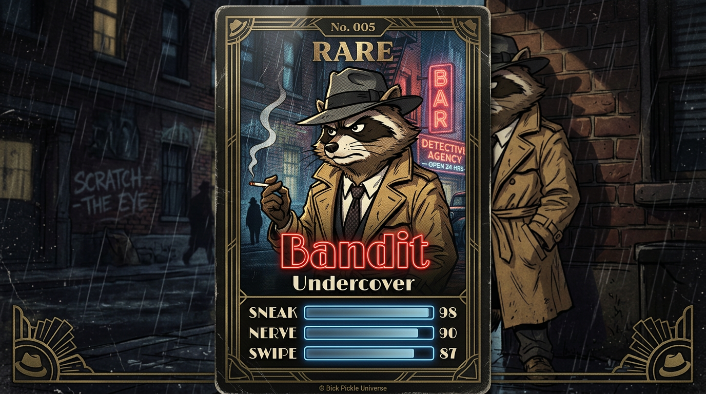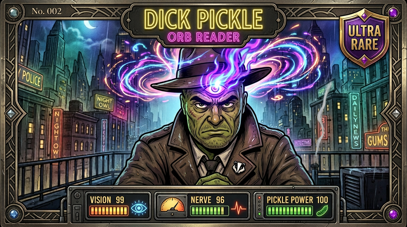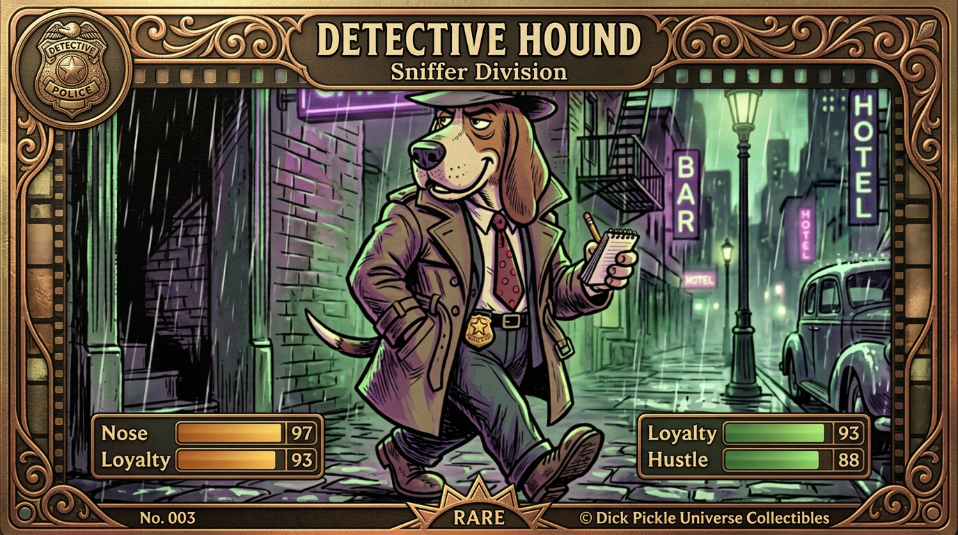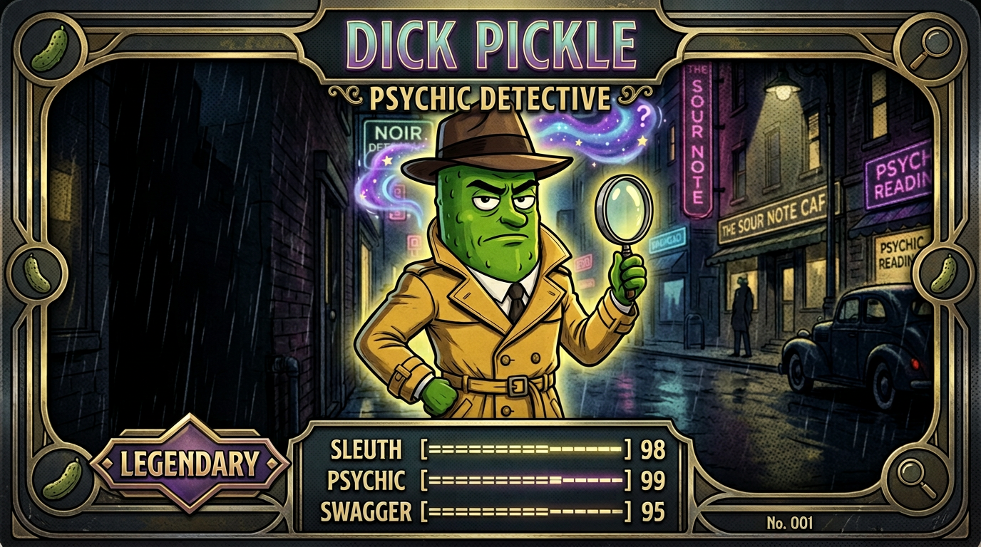 The first Dick Pickle trading card set is now live. It includes two Dick Pickle hero cards and ten supporting character cards, each styled like a premium noir collectible.