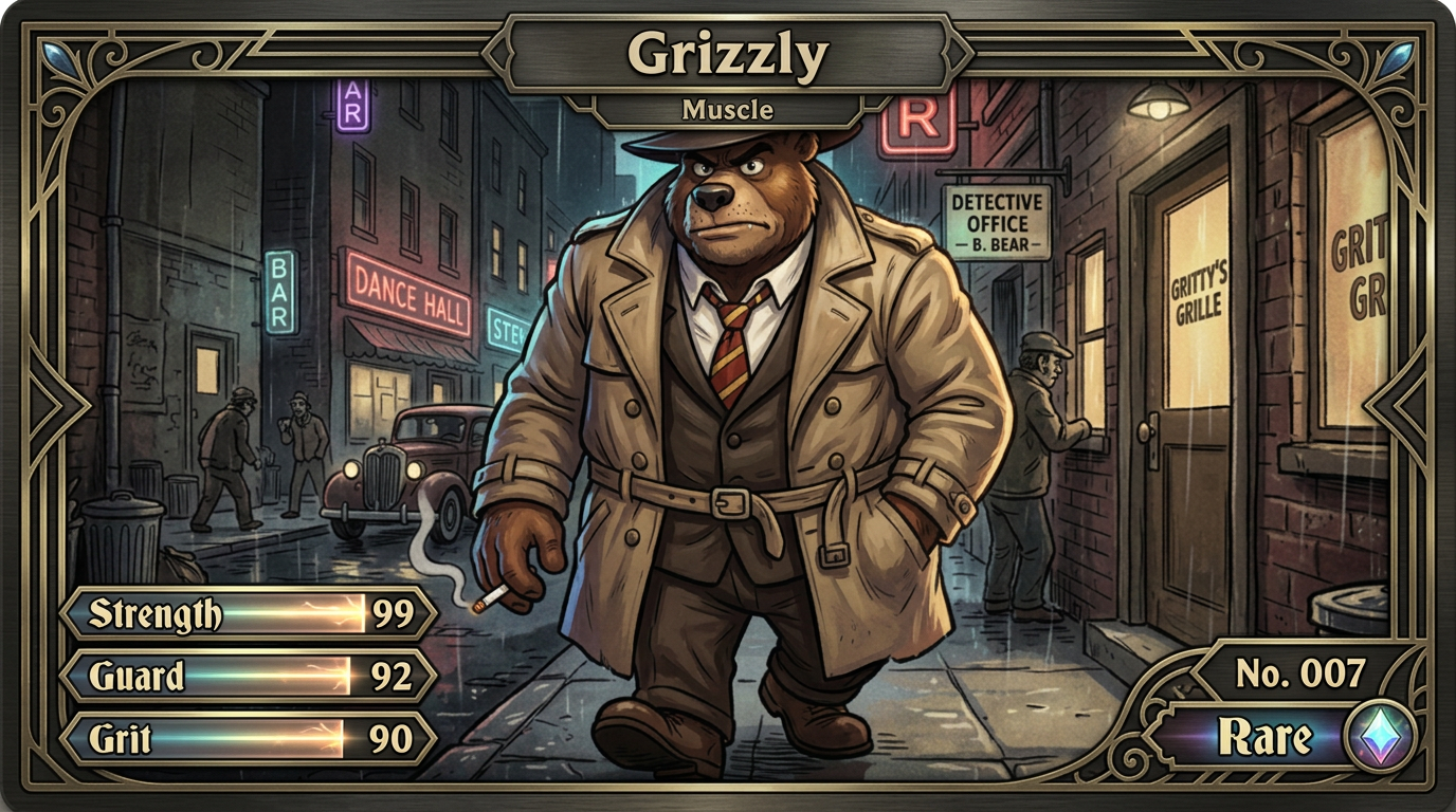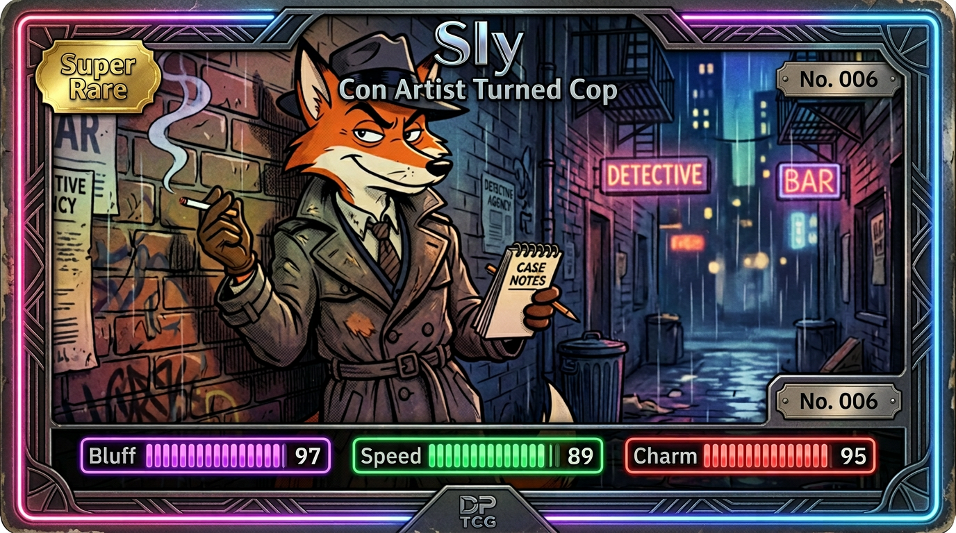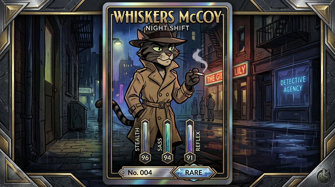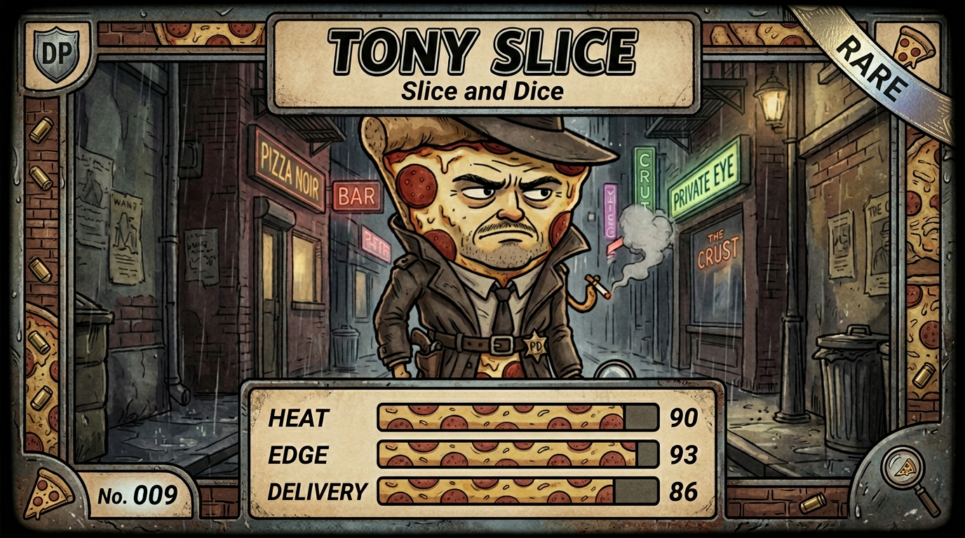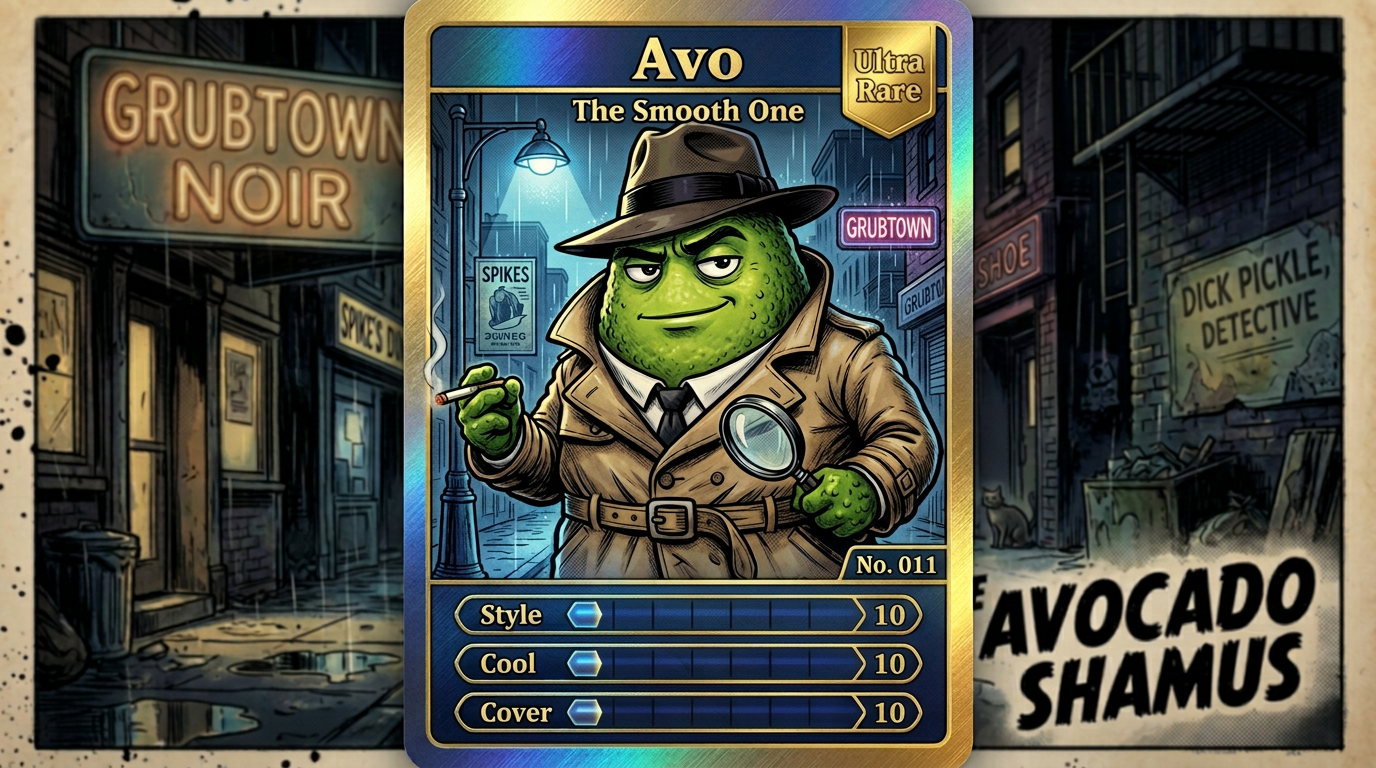 The first Dick Pickle trading card set is now live. It includes two Dick Pickle hero cards and ten supporting character cards, each styled like a premium noir collectible.