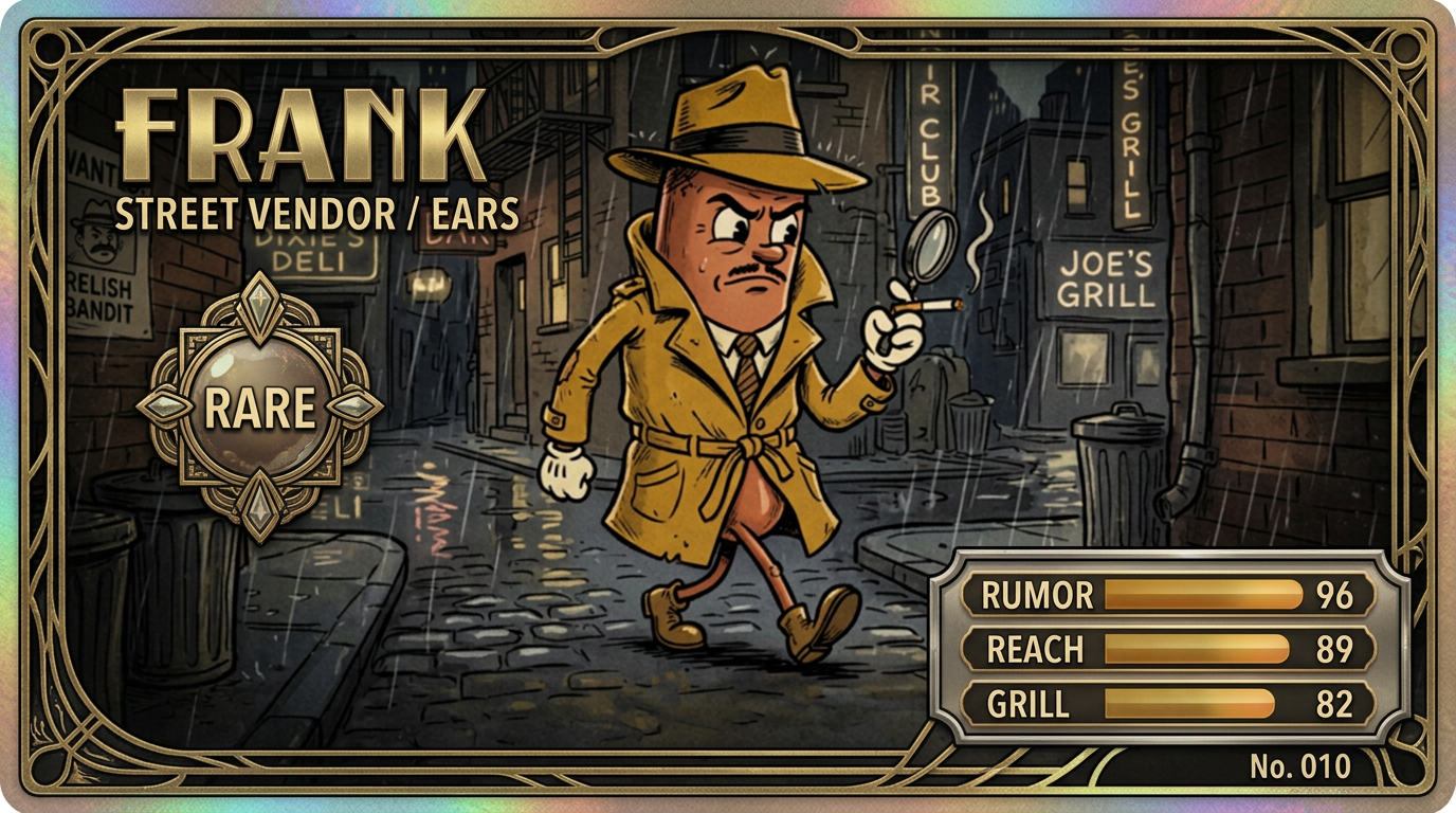 Street Vendor / Ears card with rumor control, grill energy, and nonstop neighborhood intel.