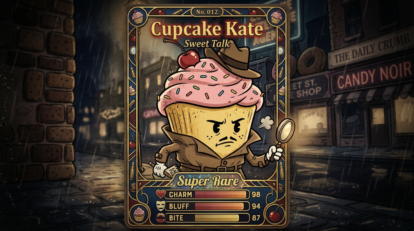 Super rare informant card with crumbs, chatter, and exactly the wrong amount of confidence.